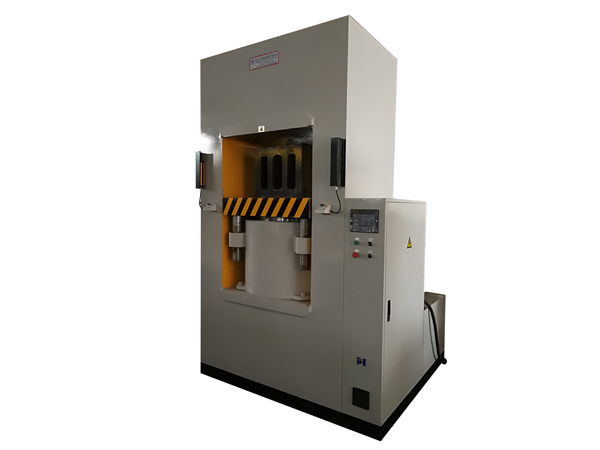 四柱液壓機包括機座、立柱、上橫梁、活動(dòng)橫梁和液壓油缸,立柱固裝在機座,立柱頂部固裝上橫梁,活動(dòng)橫梁套裝在立柱上,液壓油缸固裝在上橫梁上,液壓油缸的輸出桿與活動(dòng)橫梁相連接,帶動(dòng)活動(dòng)橫梁沿立柱上下移動(dòng),液壓油缸連接柱塞泵,柱塞泵連接液壓控制單元,機座上設有若干個(gè)壓力傳感器,壓力傳感器與液壓控制單元連接。本產(chǎn)品可將液壓機的壓力信息反饋到液壓控制單元,液壓控制單元根據成型工藝參數快速對液壓油缸的壓力進(jìn)行調整,使用整個(gè)液壓過(guò)程的壓力掌控更加穩定,滿(mǎn)足不同工藝的需求。壓力傳感器為4個(gè),分別設置在機座的4個(gè)角上,使測量得到的壓力信號更準確。